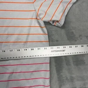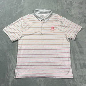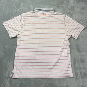 This Under Armour men's XL gray and orange striped Playoff Polo features a collared neckline, button closure, and short sleeves, making it perfect for casual and activewear occasions in the summer and spring seasons. Made from a blended fabric, this polo shirt is easy to care for and breathable, with a regular fit and chest size of 45 inches. It also includes the Under Armour logo as an accent, adding a stylish touch to the outdoor-themed design ideal for golf or other outdoor activities. Made in Jordan, this polo shirt combines comfort and performance in a stylish package.