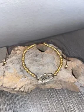 Stylish gold-tone beaded bracelet featuring a 'Love' charm with crystal accents. Adjustable cord for a comfortable fit. Elegant gold finish adds a warm, polished look. Perfect everyday bracelet to layer or wear alone. 5.5” to 8” inch adjustable BUNDLE 5 items marked 5/$10❤️❤️❤️offer $10 I will ACCEPT! Must bundle 2 or more items from any of my closets OK TO BUNDLE With Any other ITEMS I ADJUST THE PRICING IN YOUR BUNDLE under 5 pounds please! I carefully pack items so you get all your goodies! Minimum Order from my closet is $10…I’m at my lowest on SALE ITEMS
