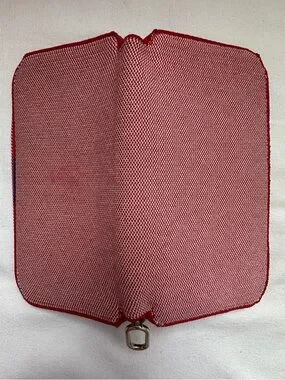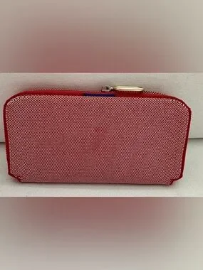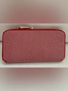 Vibrant and chic red and white gingham woven zip wallet. Smooth gold-tone zipper detail. Clean, minimalist silhouette. Great for cards and small essentials. IPhone 14 pro fits inside zipped.