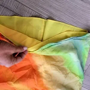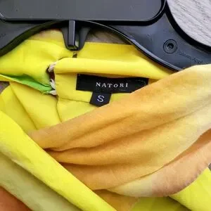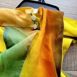 Lightweight ombre camisole with a crossed halter neckline. Smooth, airy fabric that drapes nicely. Bright gradient from yellow to orange to green. Versatile for day or evening styling.