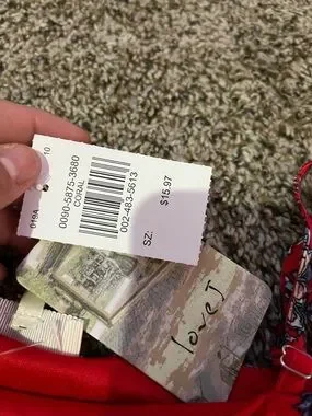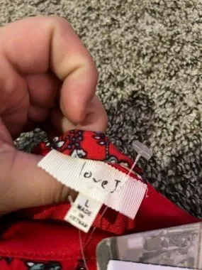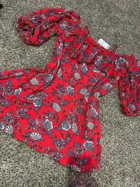 Vibrant red mini dress with all-over floral print. Off-shoulder neckline with elasticized ruffle. Short puff sleeves with tie details. Flowy skirt for easy movement.