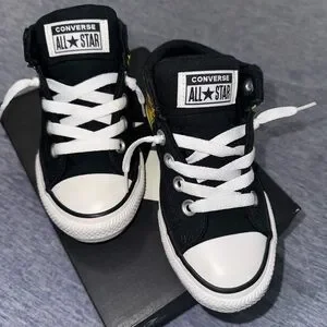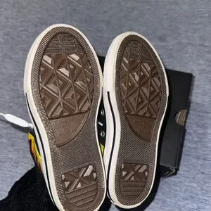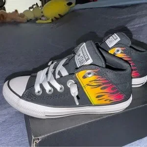 Eye-catching black sneakers with vibrant yellow flame design. Classic Converse style for kids. These are nearly new. Worn once for a maybe 2 hours. Small faint scuff marks on the top white part of the shoes that cover the toe area (picture included). Boys size 12. Pet friendly non smoking home.