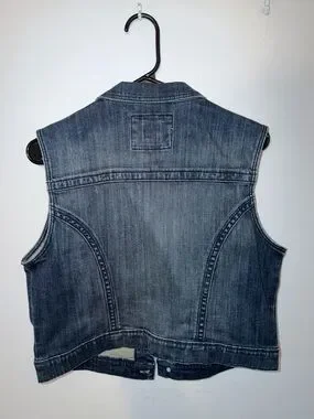 Sleeveless indigo denim vest with button-front closure. Chest flap pockets and classic collar. Casual layering piece with subtle faded details.