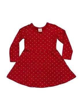 Step into the story of twirls and giggles with this delightful Hanna Andersson skater dress. The vibrant red fabric dotted with golden polka dots exudes charm, perfect for making memories. Crafted for comfort and style, it’s a wardrobe treasure for little ones.