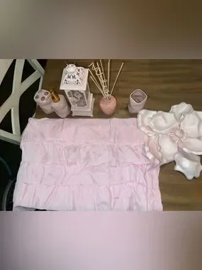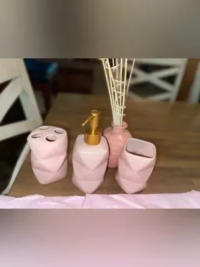 • Pink bathroom/vanity accessories (cup, toothbrush holder, soap dispenser)