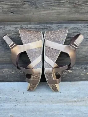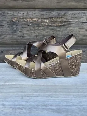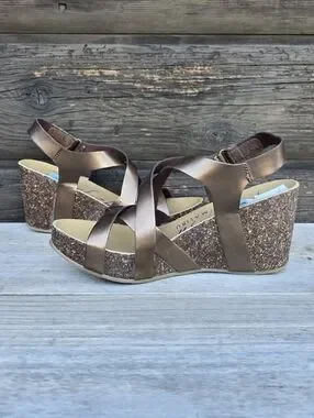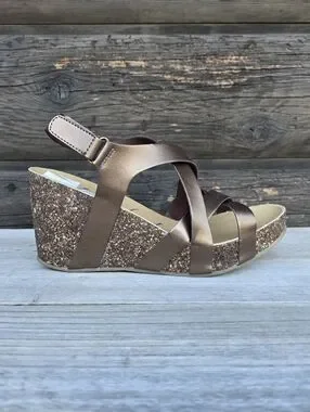 Bronze metallic Blowfish Malibu Henrietta wedge sandals with a laid-back Y2K Boho Revival vibe. Designed with sleek crisscross straps, an open toe, and an adjustable slingback, these sandals pair effortless comfort with standout summer style. The cork-look wedge adds that earthy early-2000s feel, while the warm bronze finish gives them a casual glow that works perfectly with denim, sundresses, or flowy resort looks. Easy, flattering, and versatile for everyday wear, vacation outfits, and festival-inspired styling.