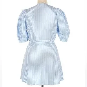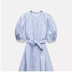 Elevated Zara ZW Collection mini dress featuring classic blue and white stripes in crisp cotton poplin. Designed with a flattering silhouette and puff sleeves for a chic, feminine look. Lightweight and breathable—perfect for warm weather styling.