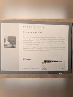 Framed print featuring a single tree with vibrant red-orange foliage. Soft cream mat surrounds the artwork. Warm, muted tones create a serene landscape feel.