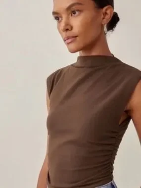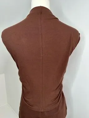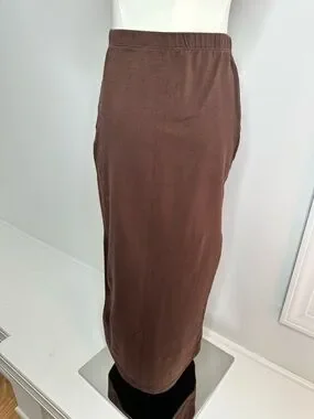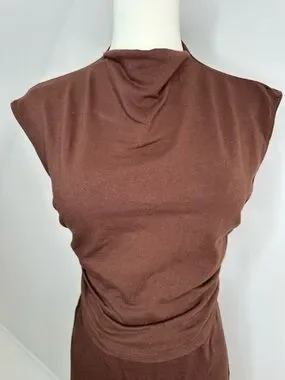 Reformation brown organic cotton knit two piece set, mock neck ruched top and midi skirt, women’s size S