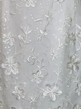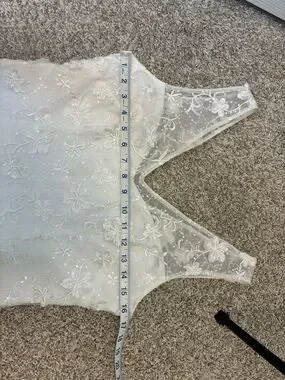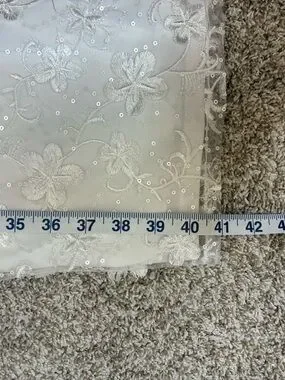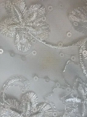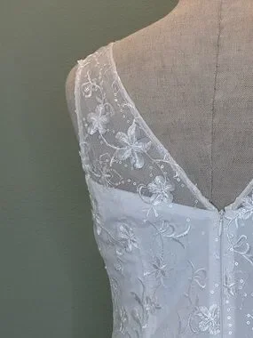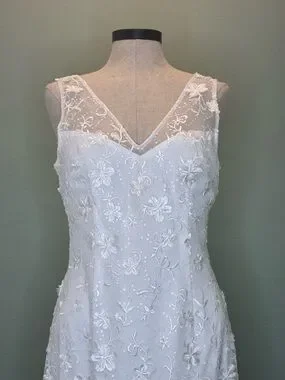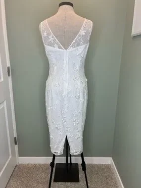 Ivory sheath dress with intricate floral appliqués. V-neckline with sheer mesh yoke. Sleeveless design for a clean profile. Elegant draped hem detail. 2 Very small spots on the front as shown in photo. I have not attempted to get it out.