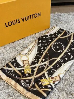 Design & Theme: This exquisite silk scarf features a sophisticated interplay of the iconic Monogram pattern alongside artistic illustrations of leather straps, metal chains, and classic LV padlocks. The striking contrast between the deep black, warm beige, and golden accents creates a luxurious, versatile aesthetic.