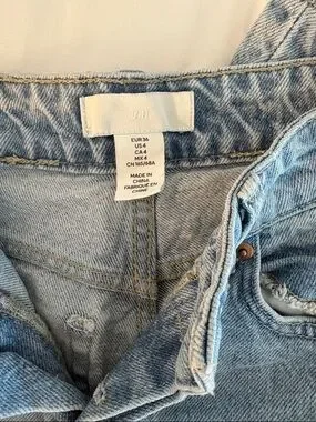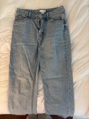 H&M straight leg jeans in a light blue denim wash. Mid to high rise with a classic five-pocket design. Button fly and subtle faded detailing. Versatile everyday style.