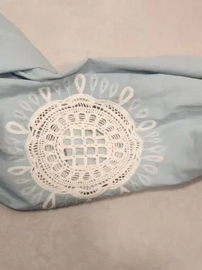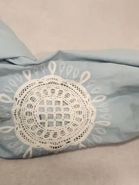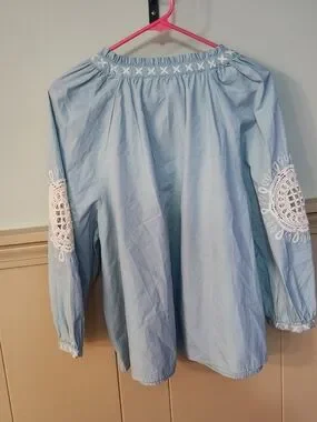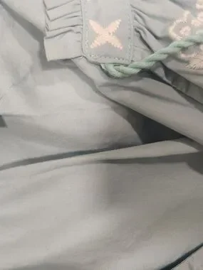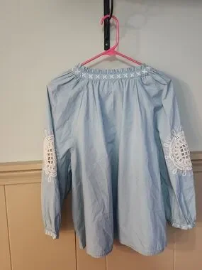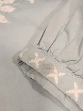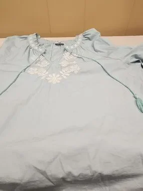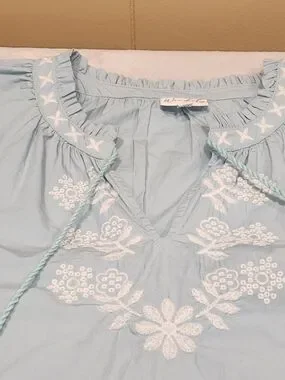 beautiful Wonderly peasant-style blouse is perfect for a breezy, bohemian look. Featuring intricate white floral embroidery on the chest and sleeves, this light blue top has a relaxed fit and feminine balloon sleeves with elastic cuffs. The V-neckline is accented with functional tassel ties for added detail. Made from a soft, airy fabric that's ideal for spring and summer.