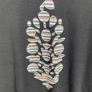 Free People FP Movement Crop Top Womens XS Black Graphic Activewear EUC. High-quality athletic shirt from the FP Movement line featuring a unique multi-color striped graphic on the front and a reflective logo detail on the back hip. Designed with a relaxed, cropped fit and short sleeves, perfect for yoga, gym, or casual athleisure wear.