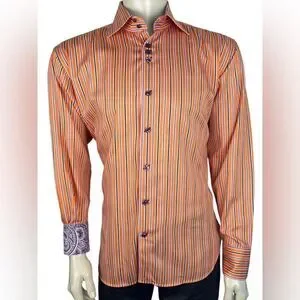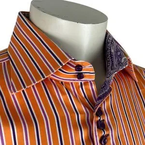 This fantastic find really makes a statement! NWOT, this vibrant long-sleeved casual dress shirt from Bertigo features amazing detail, starting with bold colors. The bright orange is striking, made more interesting with vertical stripes in hot pink and purple, lined in white. The inner collar, cuffs and button placket feature a complimentary fabric detail, in purple and white paisley. Adding that extra unique detail, the button holes on front closure are on the diagonal, finished with purple mother of pearl buttons. It's 100% cotton and a size 5, or XL, which measures: