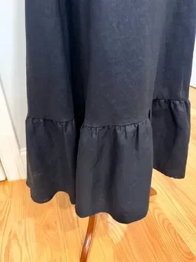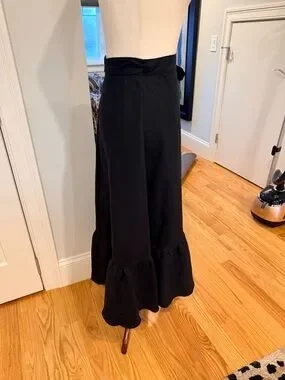 Flowy silhouette with a soft ruffle hem. Tie-waist detail creates a flattering shape. Side slit adds movement and subtle allure. Pairs easily with crop tops or fitted tees. #linen #wrap