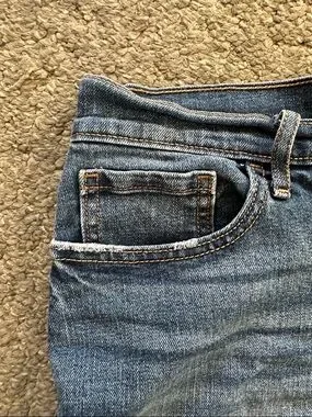 Classic cutoff denim shorts from Old Navy. Medium dark blue wash with some lighter mild distressing. Zip and single button fly.
