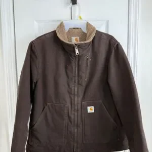 Carhartt sherpa-lined jacket in rich brown featuring a durable duck canvas exterior and cozy fleece lining. Classic workwear piece with a structured fit, front zip closure, utility pockets, and signature Carhartt logo patch. Perfect for layering and built for warmth and durability.