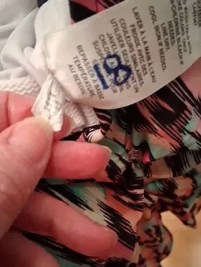 V-neck one-piece tankini swim with abstract brushstroke print. Thin adjustable straps and center tie detail. Smooth, stretchy fabric with gentle shaping through the torso. Bold multicolor pattern for a vibrant look. Built in bra, bust 21.5, length 26