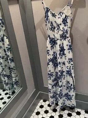 Sleeveless maxi dress with thin straps. White base with blue floral pattern. Smocked waist and gathered bust. Flowy skirt with pockets. Lightweight, breezy fabric.