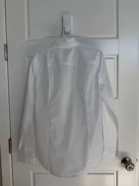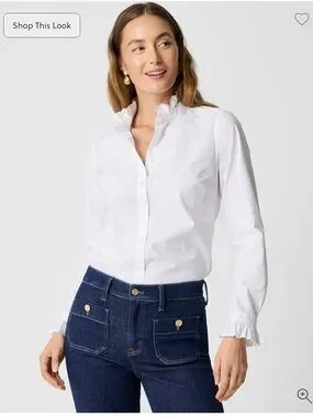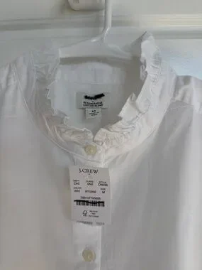 Brand new with tags J.Crew ruffle button-up top in a soft regenerative cotton blend. This piece has beautiful feminine ruffle detailing along the front and a classic button-up silhouette that makes it perfect for work, brunch, or layering under sweaters and blazers.