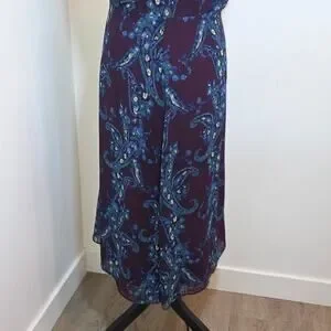 The CAbi Women's Treasure Paisley Midi Dress in size 8 is a dark purple, flowy, and artsy piece perfect for a variety of occasions from casual to formal. This A-line dress features a V-neckline, sleeveless design with strappy sleeves, and a chiffon fabric that is lightweight and sheer. The midi length dress is adorned with a paisley pattern and zipper closure, making it a stylish and versatile addition to any wardrobe. With its fairy character and bohemian theme, this dress is sure to make a statement whether for a party, wedding, or everyday wear.