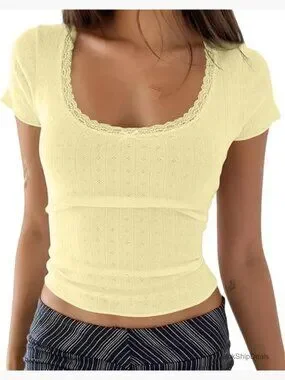 Pointelle Lace Trim Crop T-Shirt Scoop Neck Short Sleeve Slim Fit