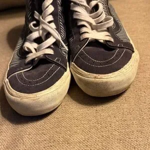 Navy and white Vans high-tops with a striped pattern. Classic skate style.