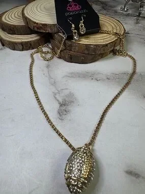 Gold-tone necklace with a sparkling crystal pavé oval pendant. Polished gold chain complements the shimmering pendant. Classic and versatile for day or night. Crafted by paparazzi for instant shine.