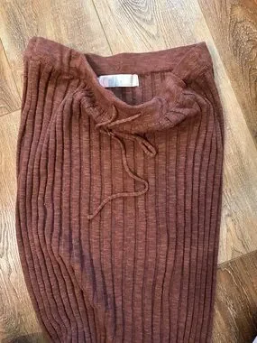 Comfortable ribbed midi skirt in chestnut brown. Soft knit fabric with a stretch fit for easy movement. Elastic waist with drawstring for a secure, adjustable fit. Versatile style that pairs well with tees, sweaters, and boots.
