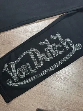 Black sweatpants with rhinestone Von Dutch script down one leg. Elastic drawstring waist and side pockets. Sparkling bling detail. Comfortable and casual.