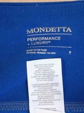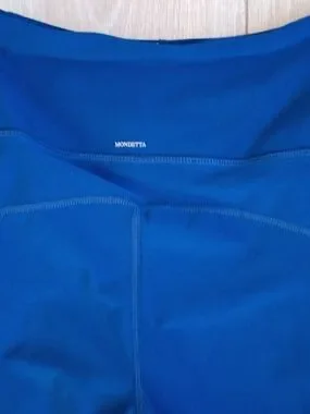 Mondetta women's high-waist leggings in solid navy blue. Smooth, stretch fabric for a snug fit. Includes side pocket for small essentials. Clean, minimal design for workouts or casual wear.