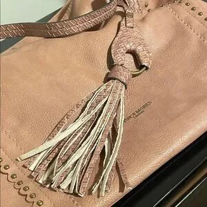 Stylish pink-taupe leather shoulder bag with studded trim. Spacious interior and sturdy double straps for comfortable wear. Clean, versatile design that pairs well with casual and dressy looks. Includes secure zip closure and subtle logo detail.