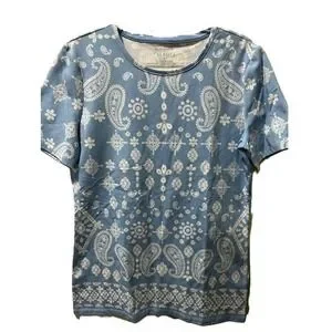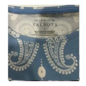 Available in a small size, the Talbots White and Blue Paisley Women's Tee offers a tailored yet natural fit that accentuates your silhouette. Pair it with jeans, skirts, or shorts to create countless outfit combinations. Its neutral color palette is easy to match with accessories, making it suitable for both casual and semi-formal occasions.