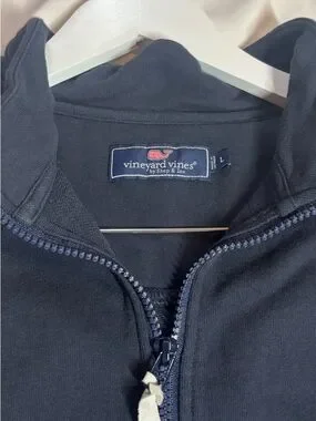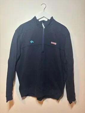 Classic quarter-zip pullover from Vineyard Vines. Deep navy body with a small teal whale embroidery. Contrast zip and logo patch add subtle detail. Comfortable, versatile top for casual wear. Pre owned, never worn, great condition.
