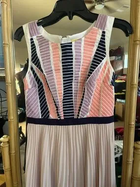 Flowing pleated maxi skirt with a defined waist. Geometric colorblock bodice with vertical stripes. Sleeveless with a round neckline. Elegant and eye-catching for special occasions.