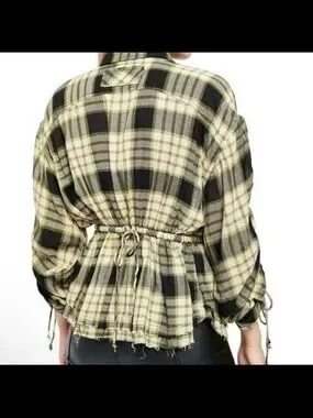 Plaid button-down top with drawstring waist. Ruched drawstring sleeves add shape. Peplum hem creates a flattered silhouette. Lightweight casual fabric for everyday wear.