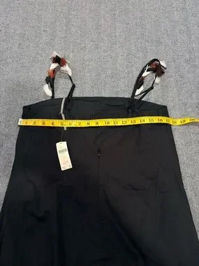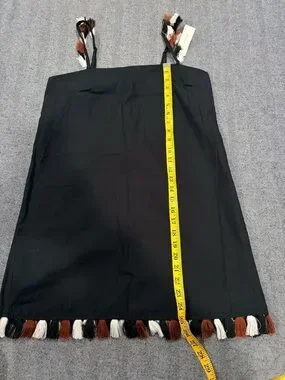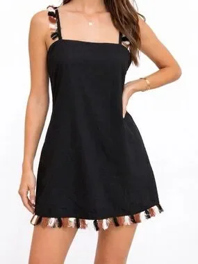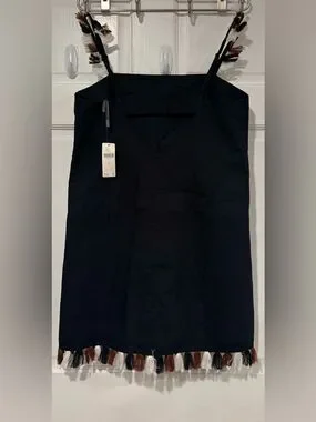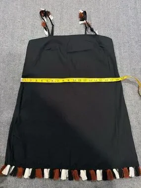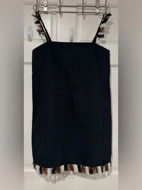 Anthropologie mini dress features a chic square neckline and adjustable spaghetti straps adorned with playful multi-colored fringe tassels. This black shift silhouette is crafted from a breathable cotton-linen blend, making it an ideal choice for warm-weather outings or beach vacations. The hemline mirrors the strap detail with a matching fringe trim in white, rust, and black tones. It includes a back zipper closure and a subtle elasticated back band for a comfortable fit.