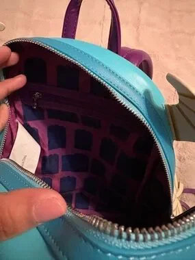 Playful Sulley face backpack with embroidered details. Soft faux-leather construction with fun ear accents. Zippered front pocket and adjustable straps. Includes character charm for added flair. Offers are welcomed 😊