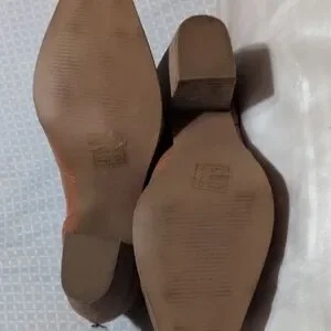 Chic cognac ankle booties with layered cutout straps. Stacked block heel adds stable height. Pointed toe with subtle western-inspired detailing. Smooth faux-leather finish for polished looks.