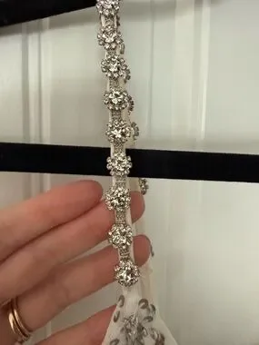 Sparkling white sequin dress with vertical fringe beading. Thin shoulder straps and a sleek silhouette. Party-ready and eye-catching.