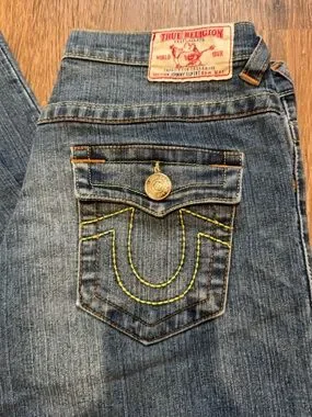True Religion straight-leg jeans in medium blue denim. Back pocket features signature horseshoe stitch and metal button. Classic five-pocket style for everyday wear. Versatile denim that pairs easily with casual outfits. Ultra low rise, 9in from inseam to button!