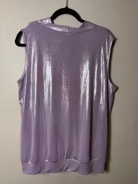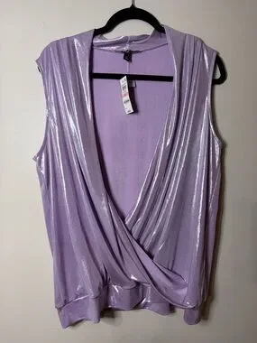 Sleeveless draped tank with a deep crossover V-neck. Lustrous shimmer fabric gives a subtle metallic glow. Relaxed fit with gathered hem for gentle shape. Versatile for dressy or casual looks. New with tag $69.50. PTP 25, length 27. 95% poly, 5 spandex.