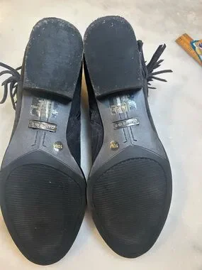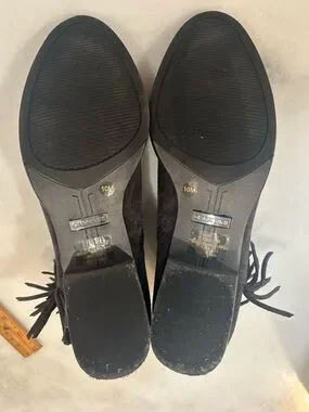 Grey suede ankle booties with fringe and braid details. Side zipper for easy wear. Low stacked heels. Minor wear on the suede and soles of the heels.