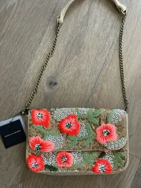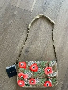 America & Beyond coral floral crossbody with gold-tone chain strap. Sparkling sequin base with embroidered coral flowers and green leaf accents. Lightweight, feminine style that elevates day or evening outfits. Secure flap closure and detachable strap for versatile wear.
