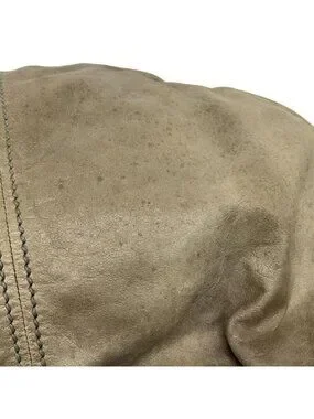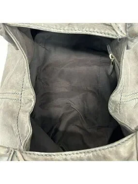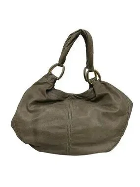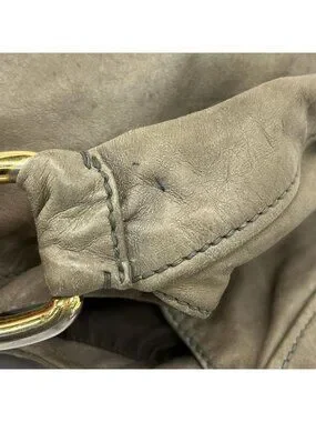 This is an authentic Miu Miu Tote in a gray and beige leather. The bag features dual gold-tone metal ring handles and a minimalist, slouchy design.
