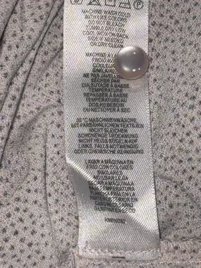 Soft light pink tunic with subtle dotted pattern. Round neckline with small back keyhole. Gentle puff sleeves with elastic cuffs. Flowing A-line silhouette. Lightweight, easy layering piece.