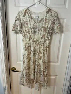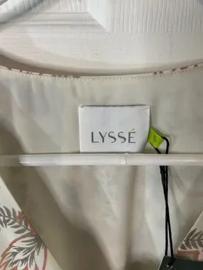 This is a NWT size small Lysse dress with a beautiful flutter sleeve that covers your shoulders, stretchy waist and a slight high-low hem. There is no fabric tag nor has it been cut out as it’s NWT- best guess polyester.