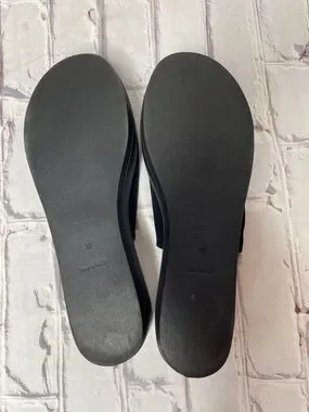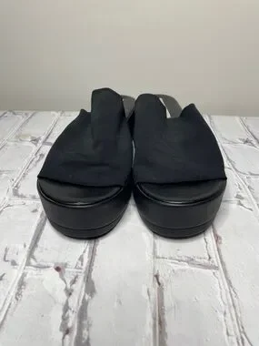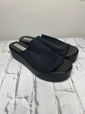 Black slip-on sandals with a fabric upper. Padded platform sole for added height. Easy pull-on design for everyday wear.