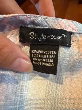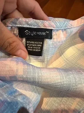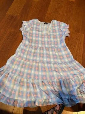 Chic asymmetrical tiered dress with a flattering V-neck. Lightweight woven fabric in a soft light blue and pink checked pattern. Short ruffle sleeves and flowy tiers for easy movement. Perfect for casual outings or weekend events.
